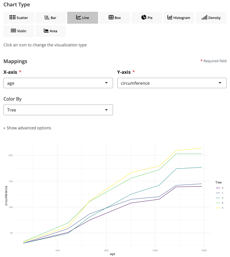Select a facet variable to create a separate panel for each unique value. The ncol parameter controls how many columns to use - facets fill columns left-to-right, then wrap to new rows. This is ideal when you have many facet levels or want automatic layout that adapts to available space.