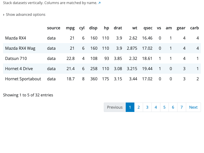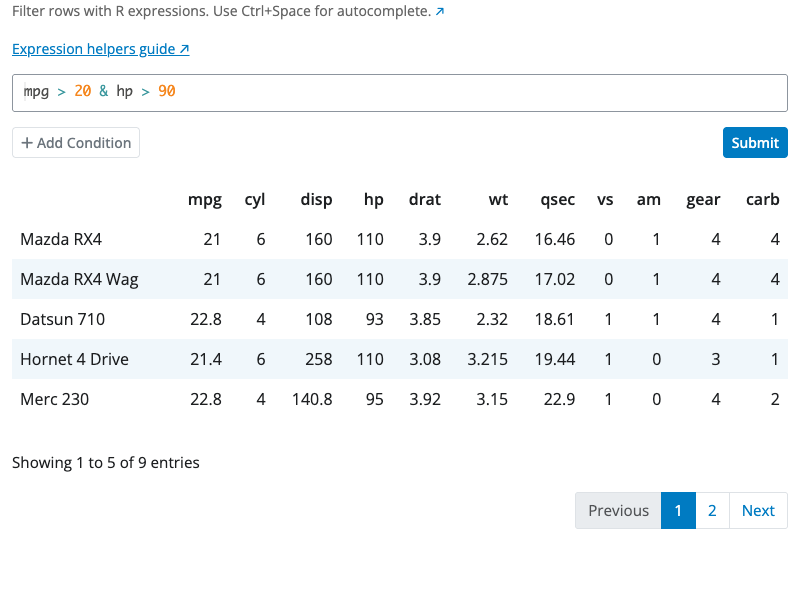 For more complex filter conditions using comparisons or calculations, use the expression filter block instead. The expression filter block allows you to write expressions like mpg > 20 or hp / wt > 50 which cannot be expressed through value selection.