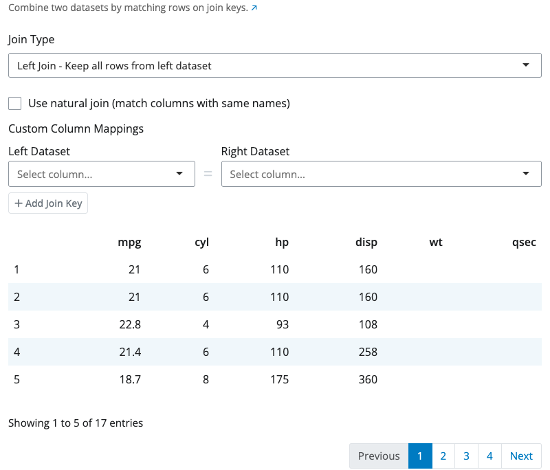 The join key interface supports both same-name joins (when columns have identical names) and different-name joins (when the matching columns have different names in each dataset). Add multiple join keys to match on multiple columns simultaneously. For different-name joins, specify which column from the left dataset matches which column from the right dataset.