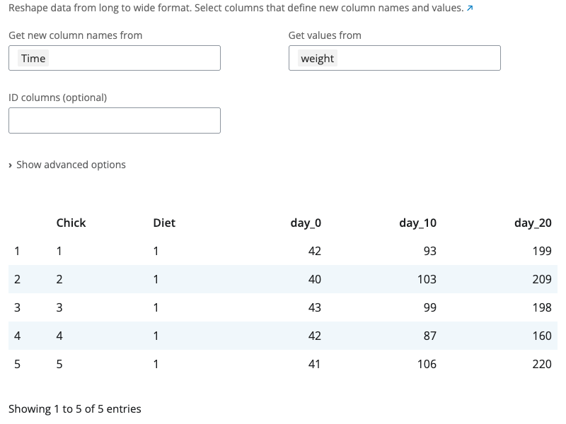 Select which column contains values for new column names (names_from) and which column contains cell values (values_from). The id_cols parameter specifies which columns identify each row. If empty, all columns not in names_from or values_from are used as identifiers.