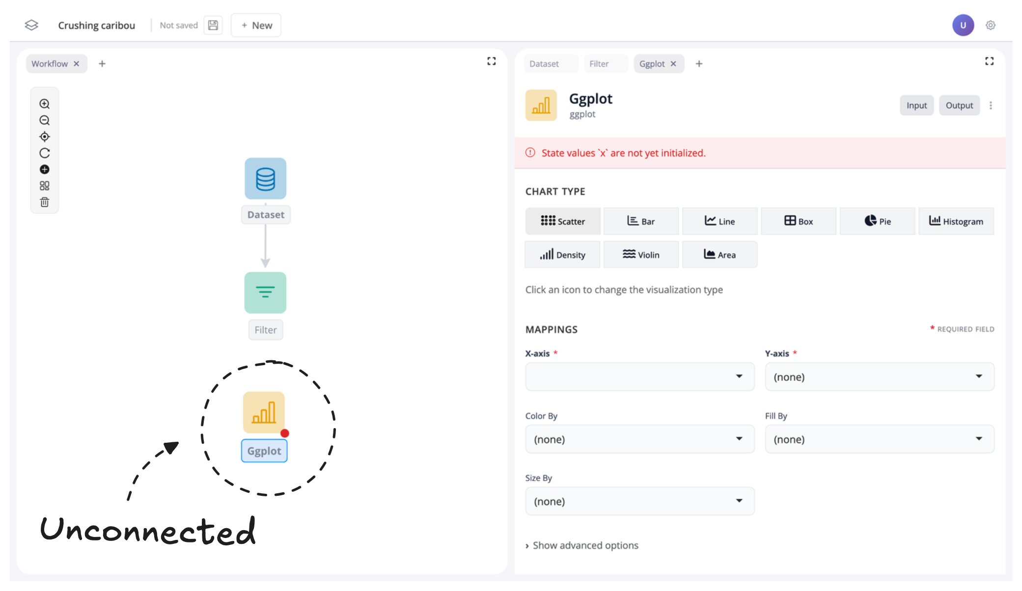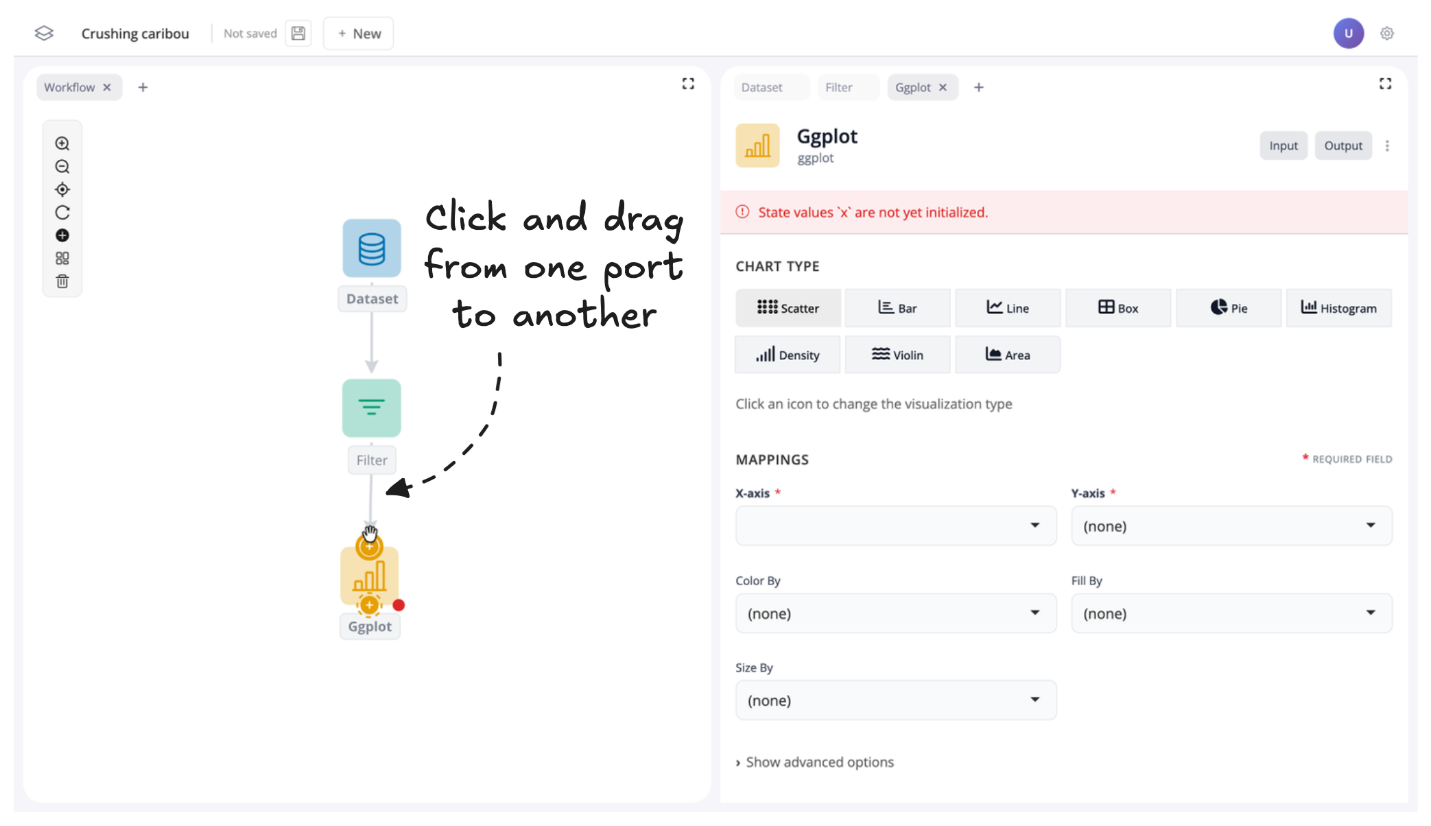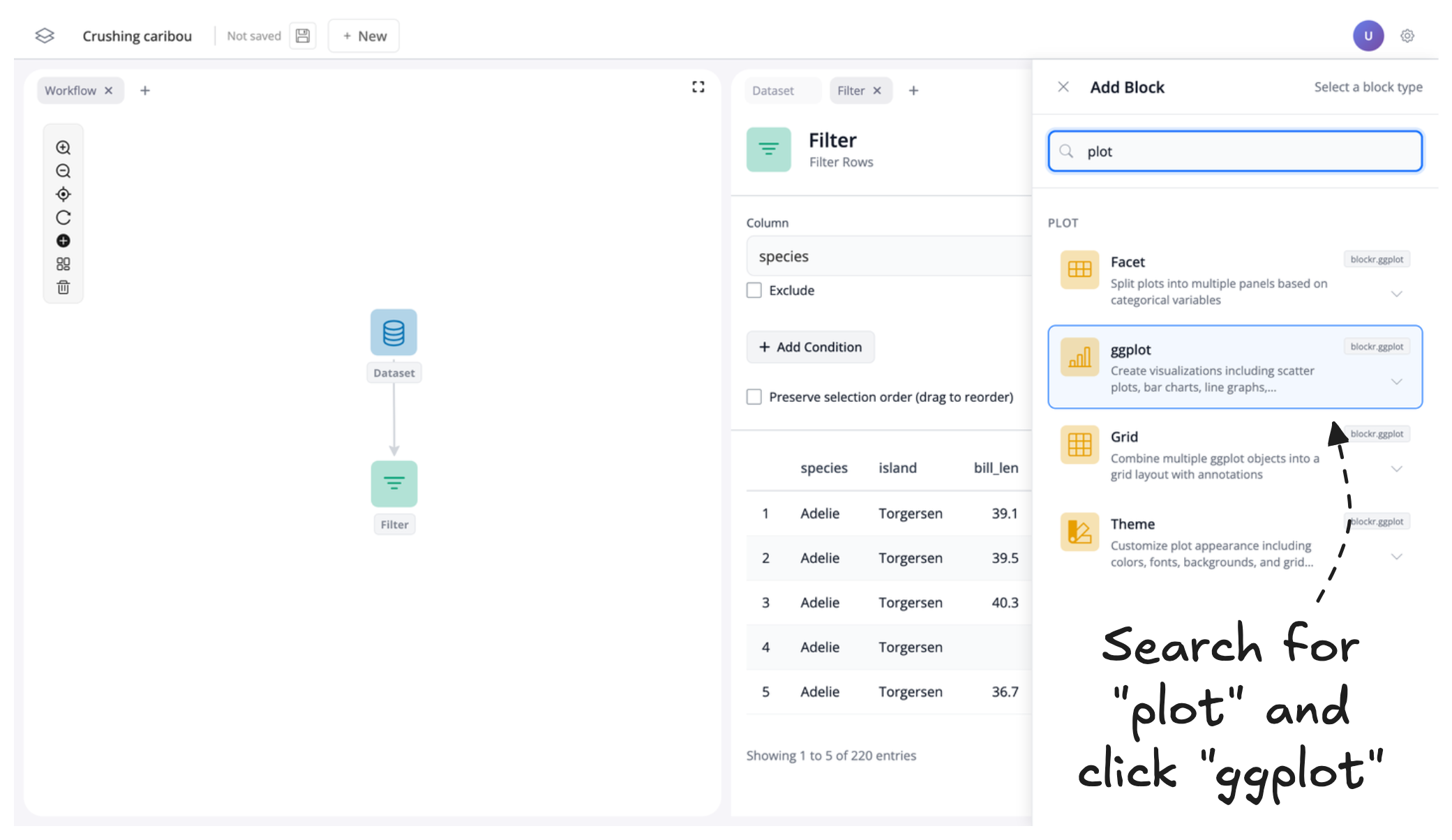 Then search for “plot” and click “ggplot” to add a plot block to our canvas: