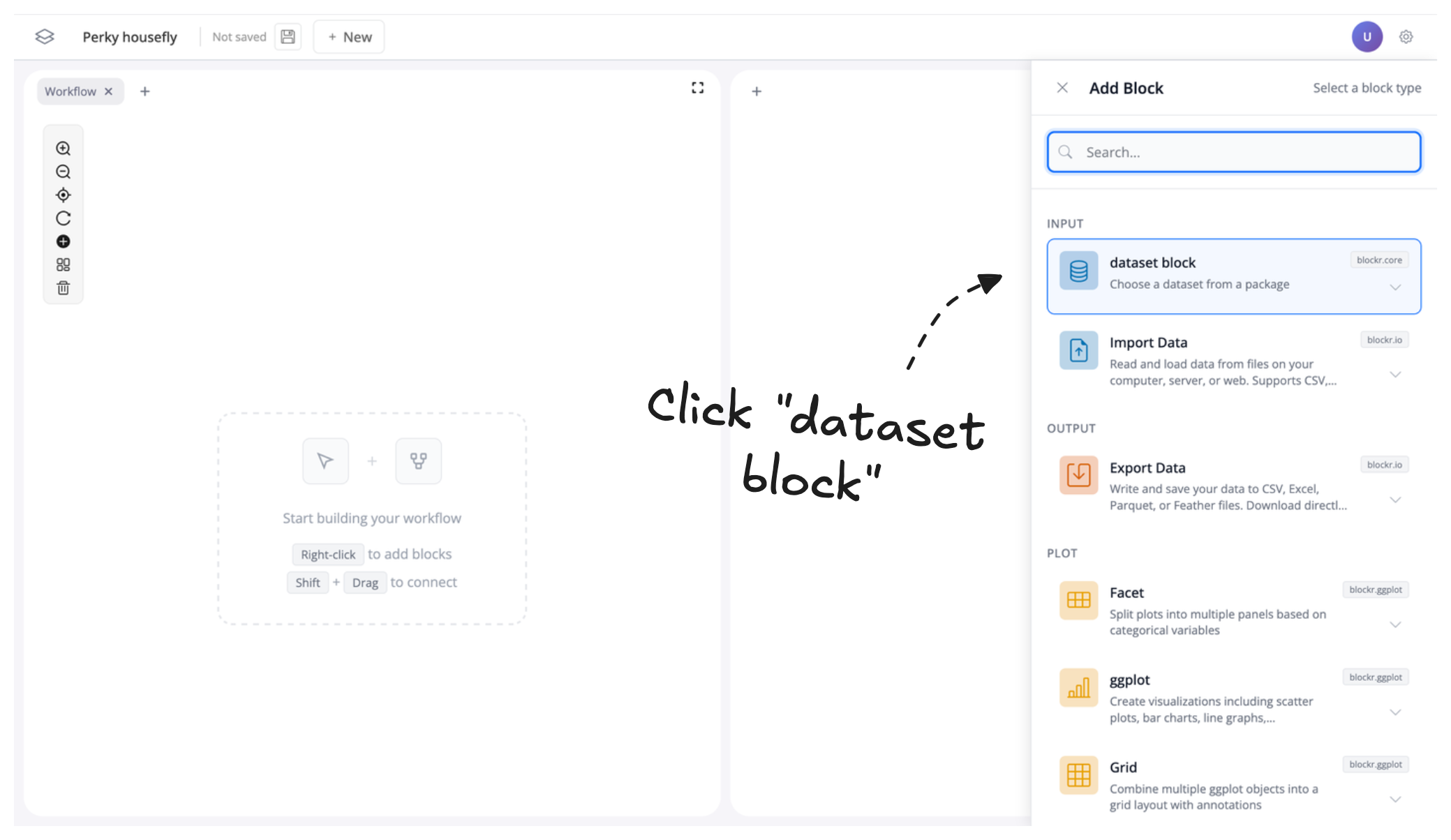 For now, let’s click “dataset block” to load an example data block, preconfigured with a bunch of different datasets.
