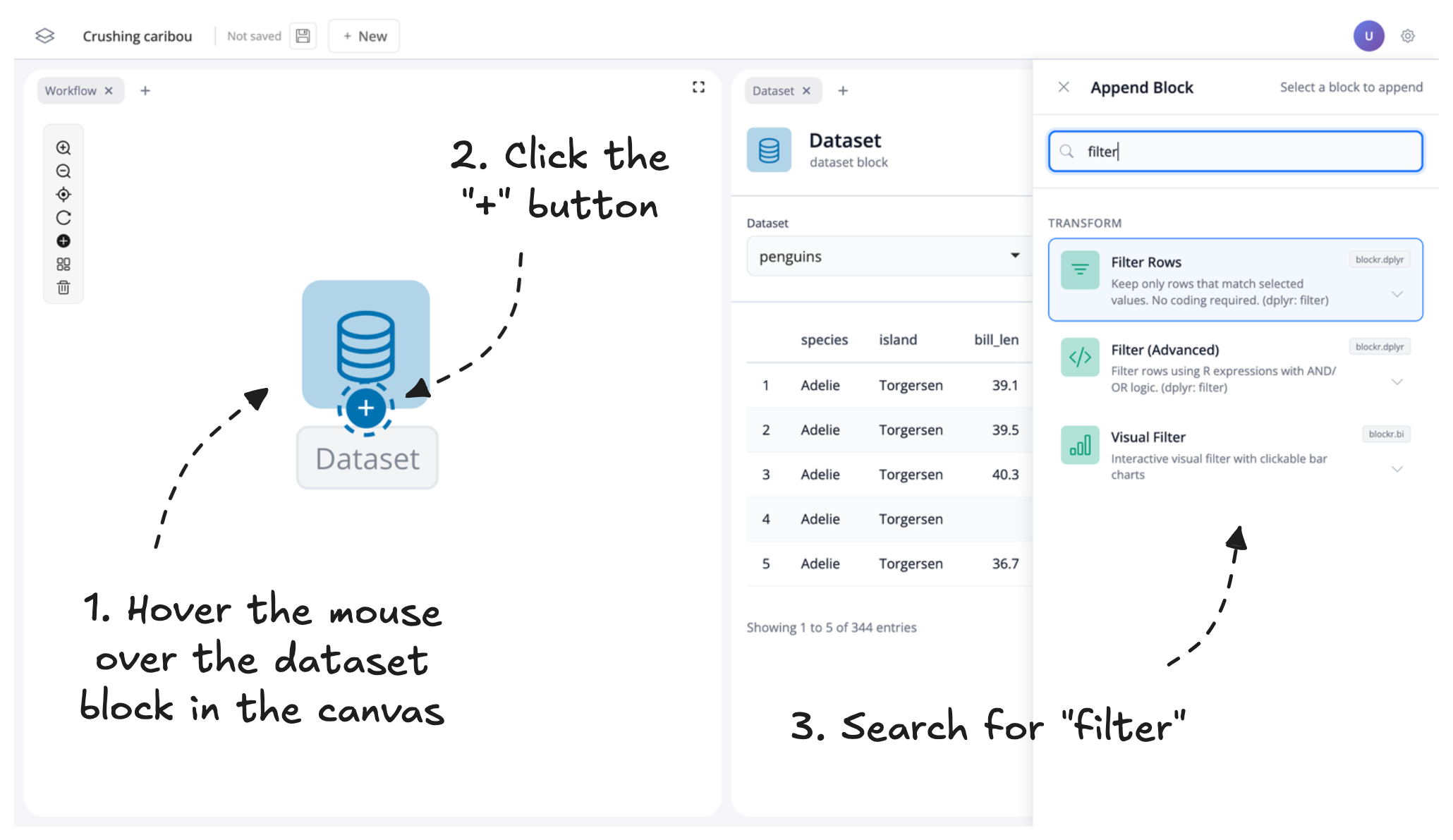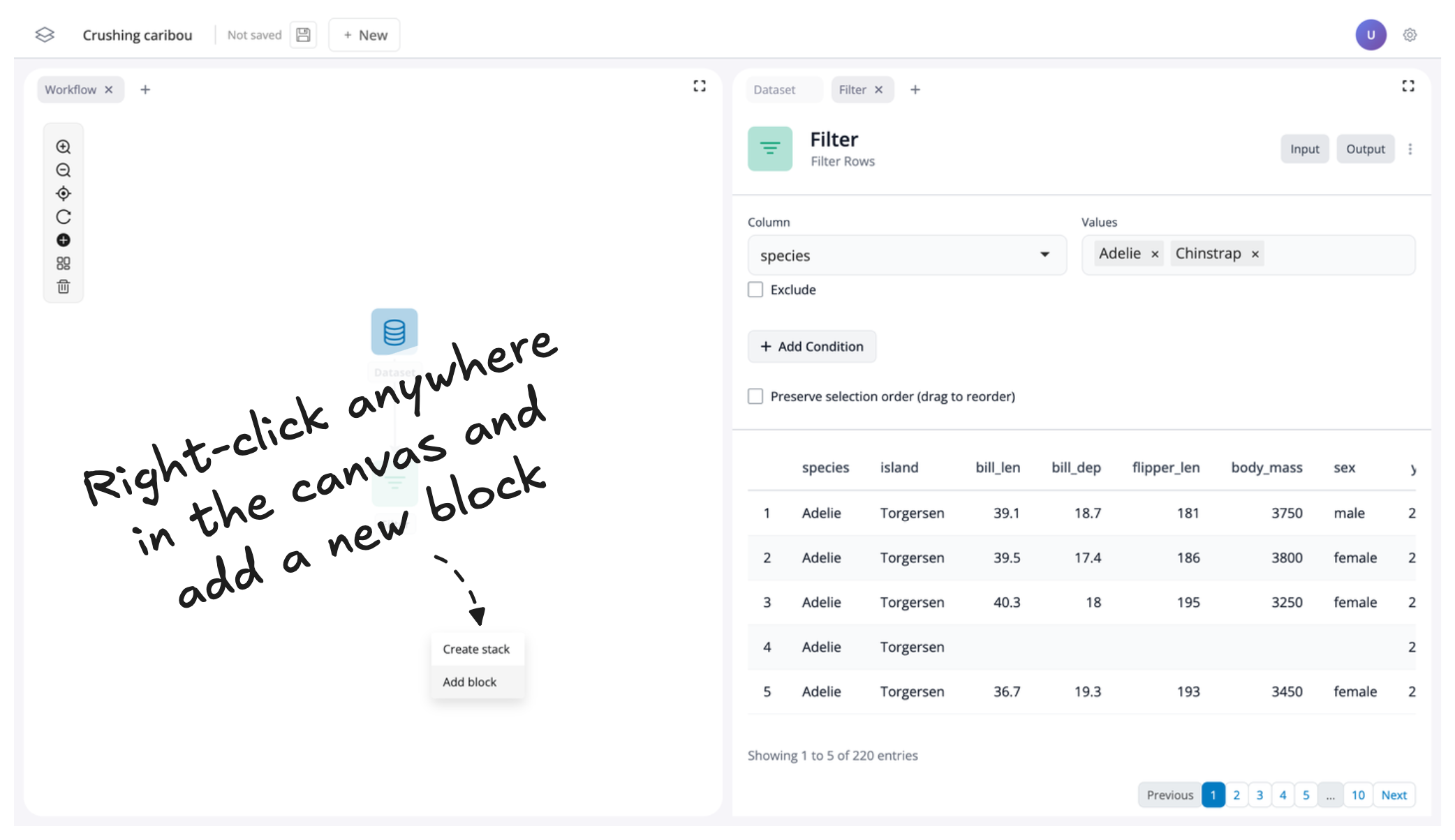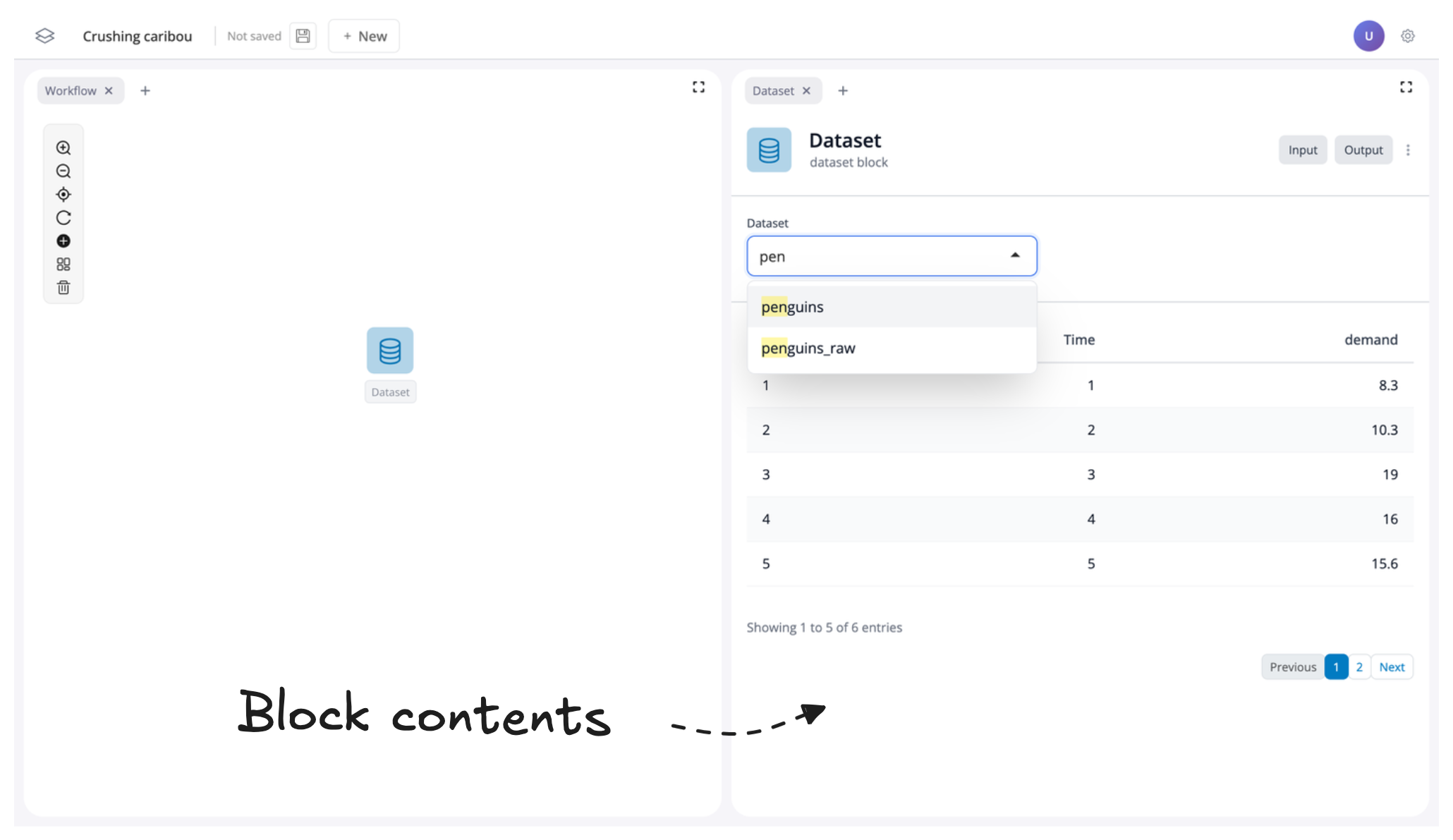 Once the block is added to the canvas, the contents of the block will be loaded to the right-hand panel. Let’s change the dataset to penguins by clicking and searching in the drop-down menu: