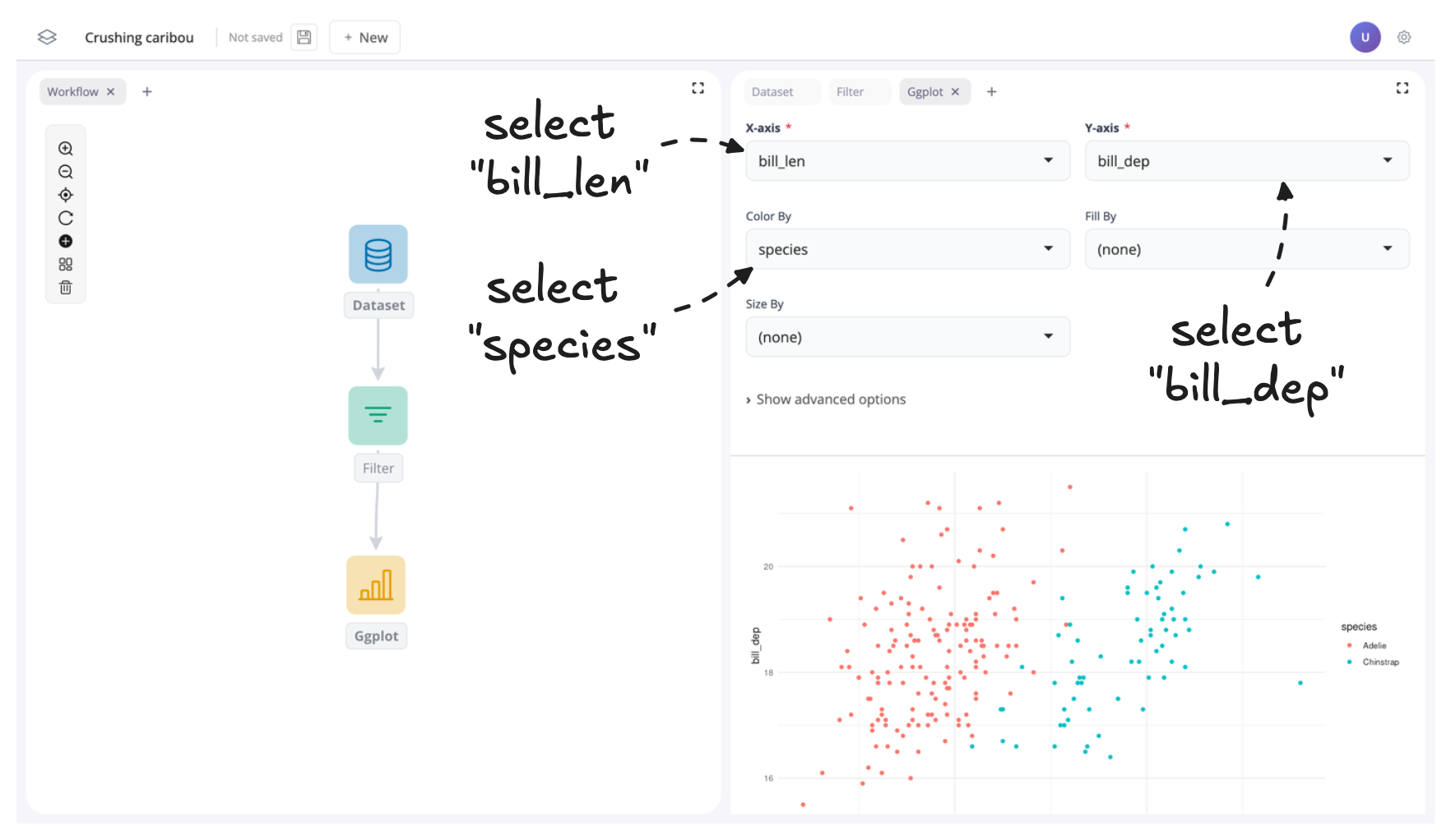 To finish let’s populate some of the inputs in the plot block to create a scatter plot of penguin bill length versus bill depth across the different species: