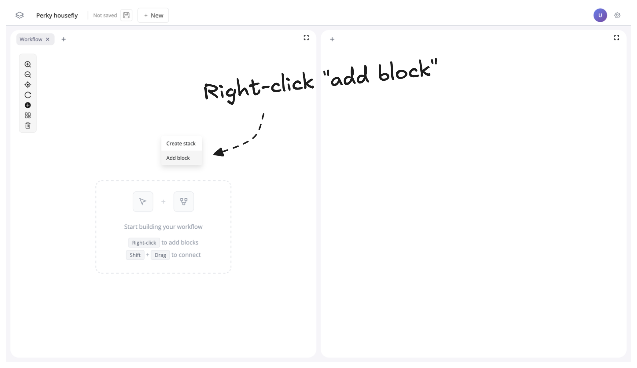 First, right-click anywhere in the canvas and click “Add block” like we did in the first step of this tutorial: