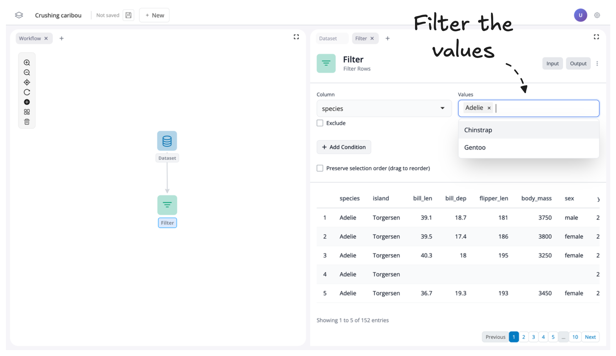 This will add a new connected filter block to the canvas. From here, we can filter the data to just keep the “Adelie” and “Chinstrap” species of penguins by seleting their values from the “Values” drop-down box:
